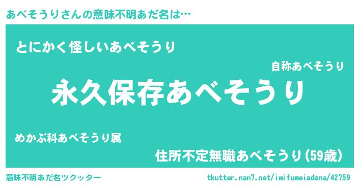 | 男性向けラノベタイトル風あだ名 | 『あべそうりという概念が存在しない退屈な世界 』 |
