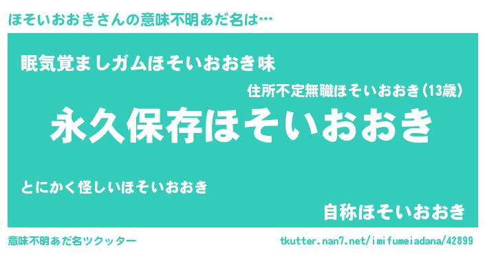 | 男性向けラノベタイトル風あだ名 | 『ほそいおおきという概念が存在しない退屈な世界 』 |
