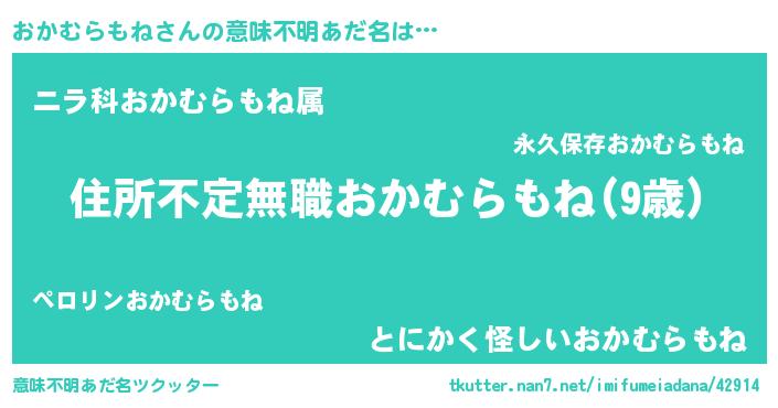 | 男性向けラノベタイトル風あだ名 | 『この素晴らしい世界におかむらもねを!』 |