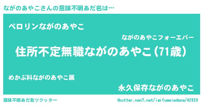 | 女子向けラノベタイトル風あだ名 | 『乙女ゲームの破滅フラグしかない悪役ながのあやこに転生してしまった…』 |