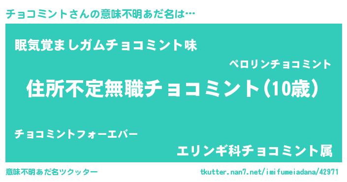 | 胡散臭い通販商品みたいなあだ名 | 『あなたにだけ特別に提供する100年もののヴィンテージワイン…その名も「チョコミント」』 |