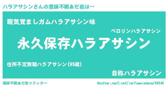 | 男性向けラノベタイトル風あだ名 | 『ハラアサシンという概念が存在しない退屈な世界 』 |