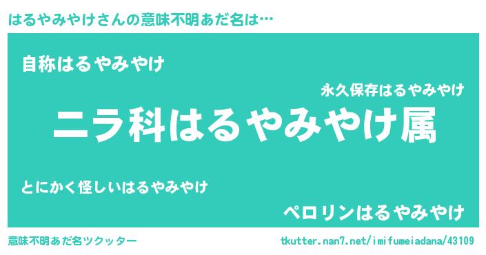 | 男性向けラノベタイトル風あだ名 | 『はるやみやけ~年齢イコール彼女いない歴の魔法使い~』 |