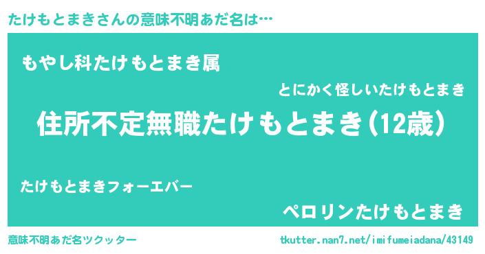 | 男性向けラノベタイトル風あだ名 | 『この素晴らしい世界にたけもとまきを!』 |