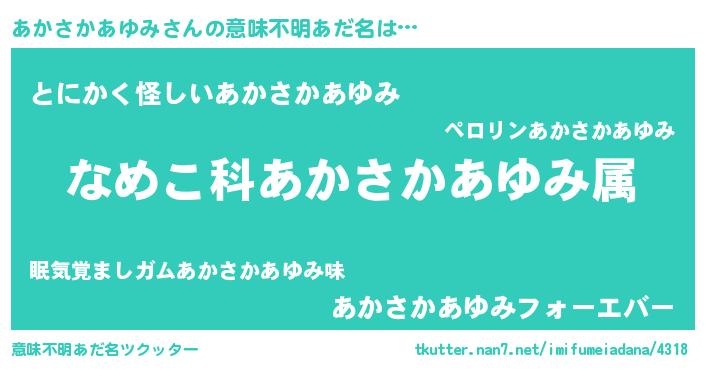 | 男性向けラノベタイトル風あだ名 | 『転生したらあかさかあゆみだった件』 |
