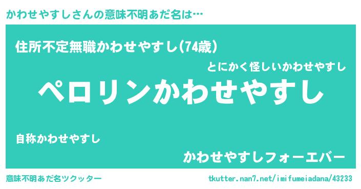 | 胡散臭い通販商品みたいなあだ名 | 『必ず成功する霊験あらたかなお札…その名も「かわせやすし」』 |