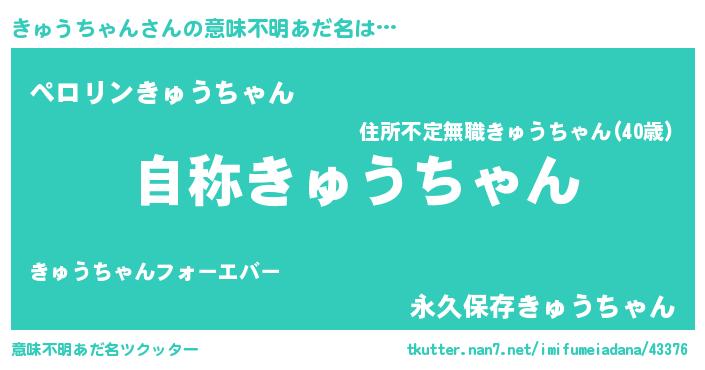 | 男性向けラノベタイトル風あだ名 | 『Re:きゅうちゃんから始める異世界生活』 |