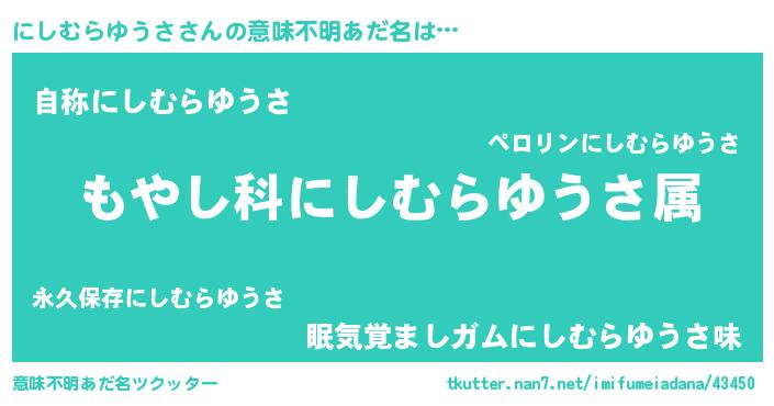 | 男性向けラノベタイトル風あだ名 | 『転生したらにしむらゆうさだった件』 |