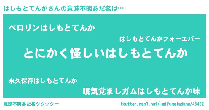 | 男性向けラノベタイトル風あだ名 | 『はしもとてんかの嫁は女の子じゃないと思った?』 |