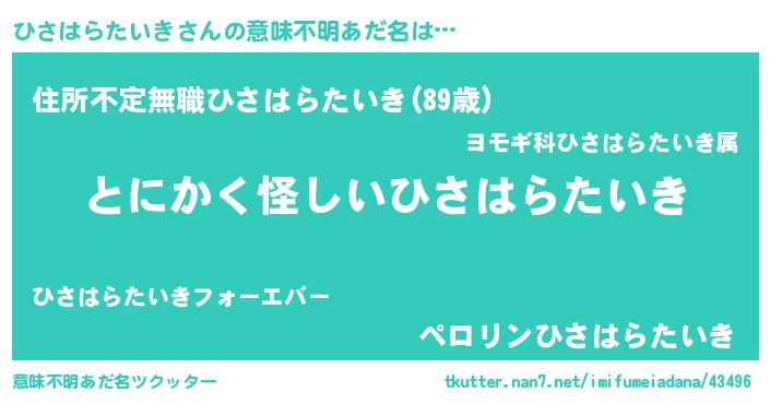 | 女子向けラノベタイトル風あだ名 | 『ひさはらたいきは平凡を望む』 |