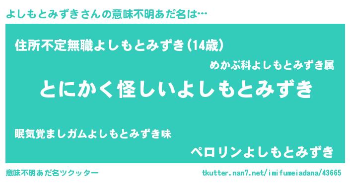 | 男性向けラノベタイトル風あだ名 | 『よしもとみずきの嫁は女の子じゃないと思った?』 |