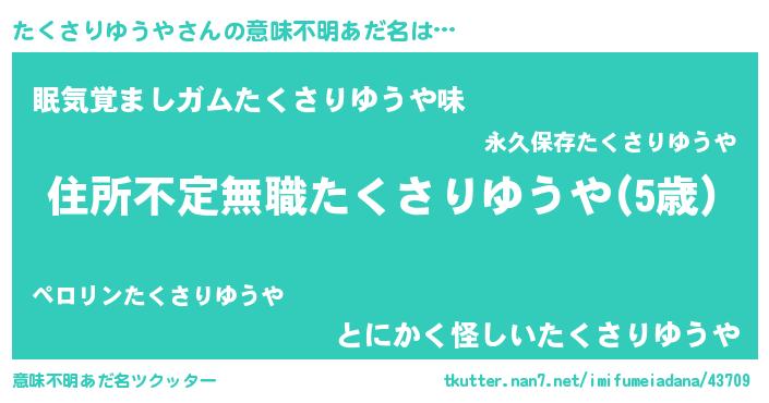 | ヘコむあだ名 | 『たくお』『たくさりゆうや(小並感)』 |