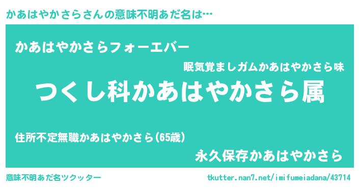 | 男性向けラノベタイトル風あだ名 | 『かあはやかさら~年齢イコール彼女いない歴の魔法使い~』 |