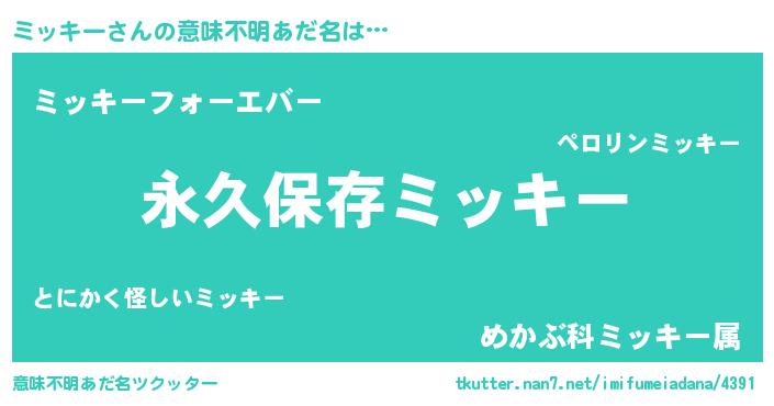 | 男性向けラノベタイトル風あだ名 | 『ミッキーに滅ぼされるだけの簡単なお仕事です』 |