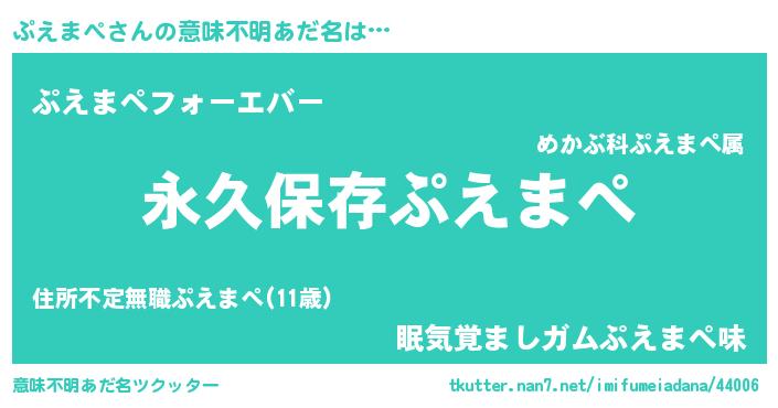 | 男性向けラノベタイトル風あだ名 | 『ぷえまぺという概念が存在しない退屈な世界 』 |