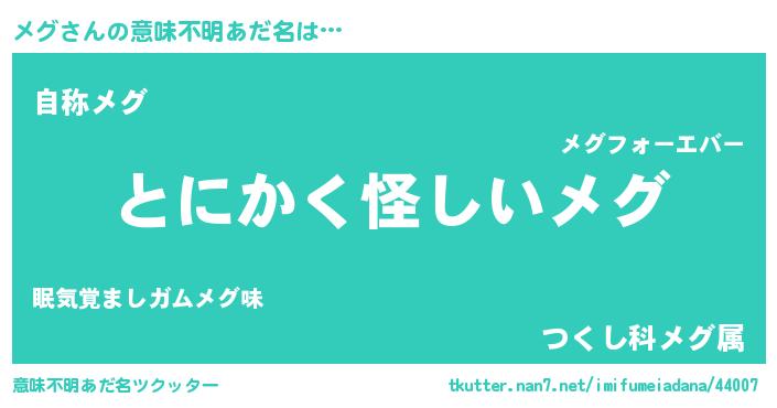 | 男性向けラノベタイトル風あだ名 | 『うちのメグが世界を掌握している!』 |