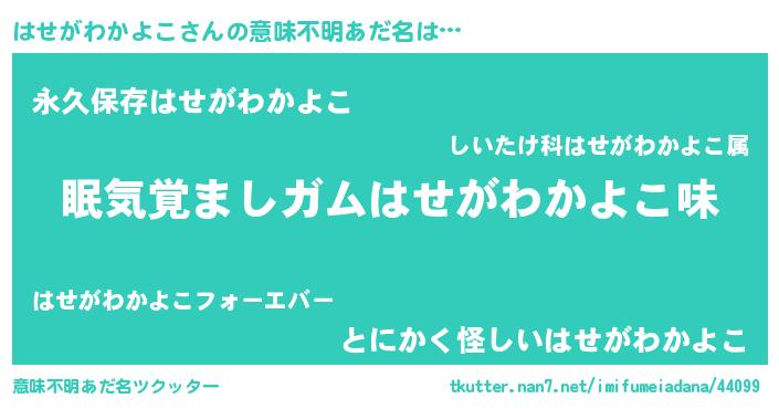 | 男性向けラノベタイトル風あだ名 | 『おまえをオタクにしてやるから、俺をはせがわかよこにしてくれ! 』 |