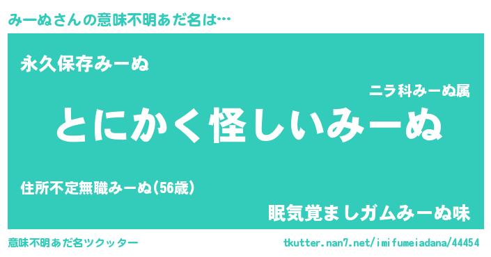 | 女子向けラノベタイトル風あだ名 | 『みーぬ様がみてる』『死神みーぬの再婚』 |