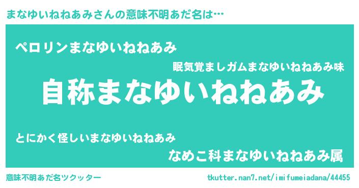 | 男性向けラノベタイトル風あだ名 | 『Re:まなゆいねねあみから始める異世界生活』 |