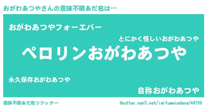 | 女子向けラノベタイトル風あだ名 | 『(仮)おがわあつやのやんごとなき事情』 |