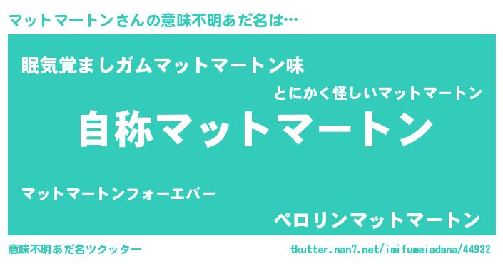 | 男性向けラノベタイトル風あだ名 | 『Re:マットマートンから始める異世界生活』 |