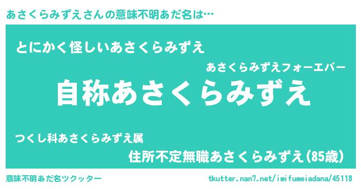| 男性向けラノベタイトル風あだ名 | 『Re:あさくらみずえから始める異世界生活』 |