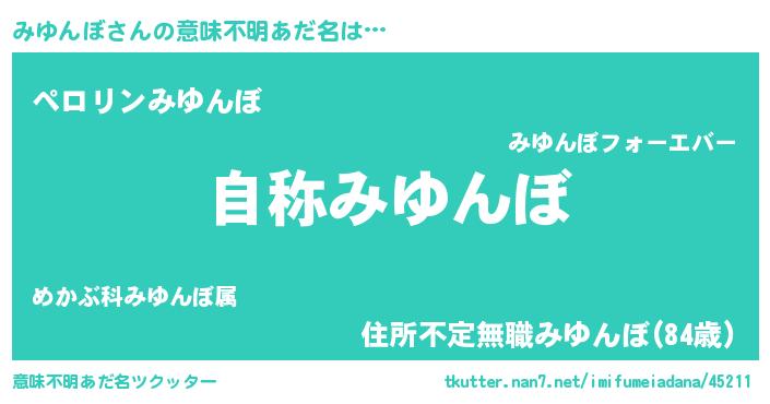 | 男性向けラノベタイトル風あだ名 | 『Re:みゆんぼから始める異世界生活』 |