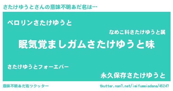 | 男性向けラノベタイトル風あだ名 | 『おまえをオタクにしてやるから、俺をさたけゆうとにしてくれ! 』 |