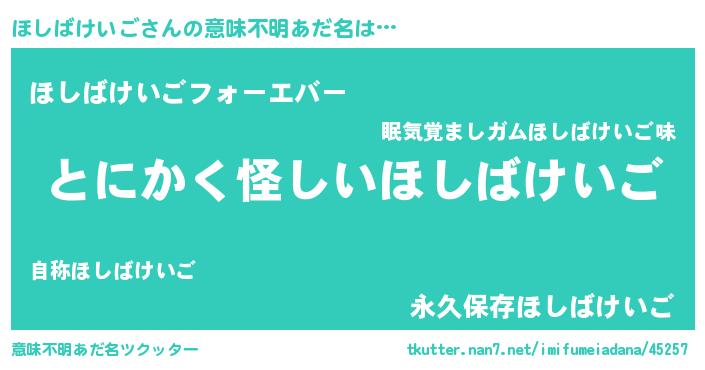 | 男性向けラノベタイトル風あだ名 | 『ほしばけいごの嫁は女の子じゃないと思った?』 |