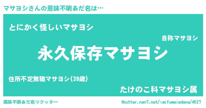 | 男性向けラノベタイトル風あだ名 | 『マサヨシという概念が存在しない退屈な世界 』 |