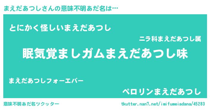 | 男性向けラノベタイトル風あだ名 | 『おまえをオタクにしてやるから、俺をまえだあつしにしてくれ! 』 |