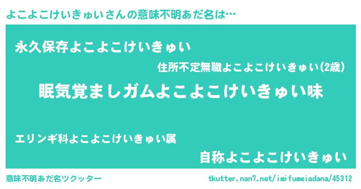 | 女子向けラノベタイトル風あだ名 | 『死神よこよこけいきゅいの再婚』 |