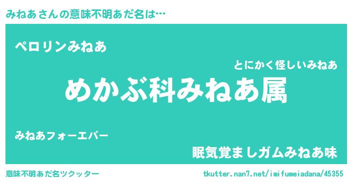 | 自動車の名前っぽいあだ名 | 『ミールスネイス』『ミネティマ』 |