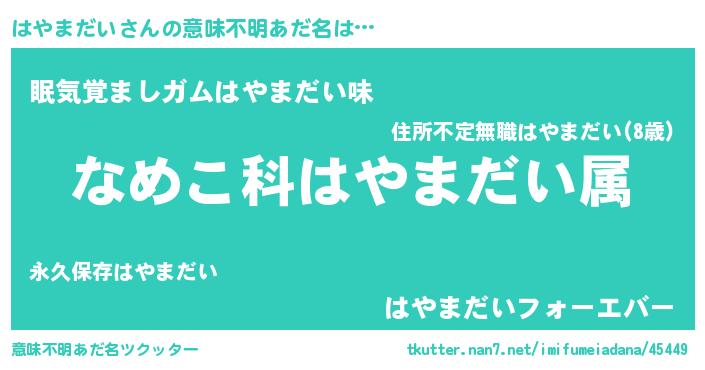 ヘコむあだ名 | 『豆乳』『はやまだい(震え声)』 |