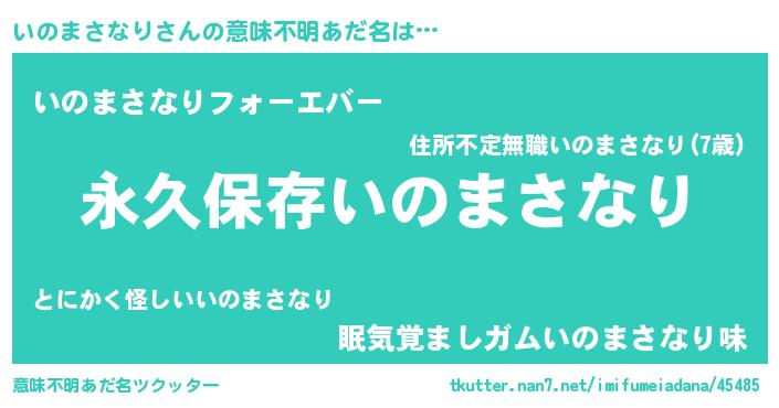 | 男性向けラノベタイトル風あだ名 | 『いのまさなりという概念が存在しない退屈な世界 』 |