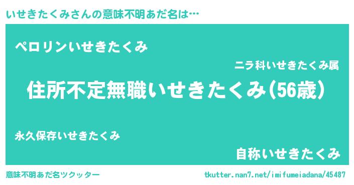 | 男性向けラノベタイトル風あだ名 | 『この素晴らしい世界にいせきたくみを!』 |