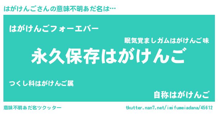 | 男性向けラノベタイトル風あだ名 | 『はがけんごという概念が存在しない退屈な世界 』 |