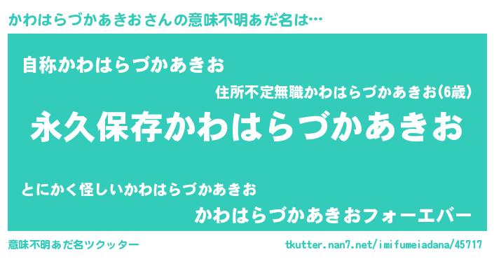 | 男性向けラノベタイトル風あだ名 | 『緋弾のカワハラヅカアキオ』 |