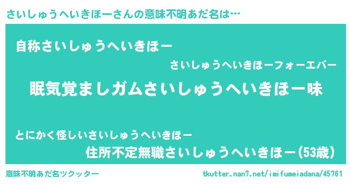 | 欧米人風あだ名 | 『ダニエルさいしゅうへいきほー』 |