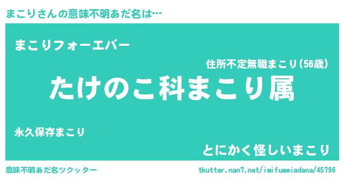 | 男性向けラノベタイトル風あだ名 | 『転生したらまこりだった件』 |