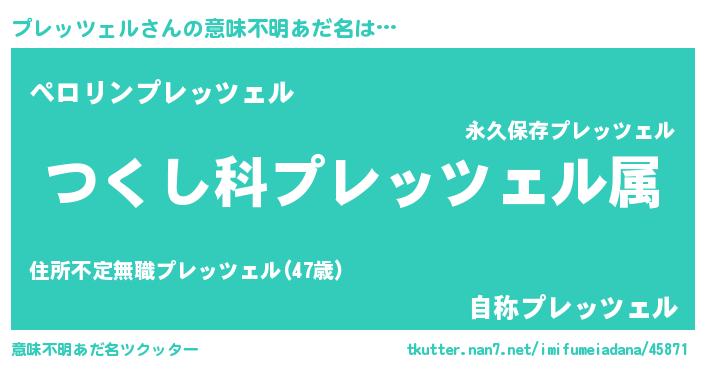 | 男性向けラノベタイトル風あだ名 | 『プレッツェル~年齢イコール彼女いない歴の魔法使い~』 |