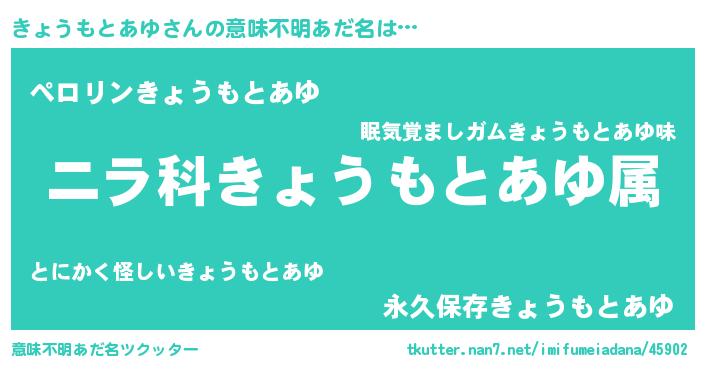 | 胡散臭い通販商品みたいなあだ名 | 『億万長者になれる霊験あらたかなお札…その名も「きょうもとあゆ」』 |