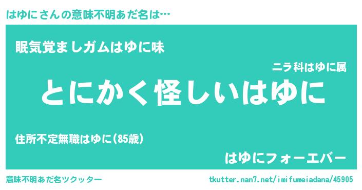 | ヒーロー風カッコイイあだ名 | 『魔戒騎士ハユ』『正義の使者はゆに』 |