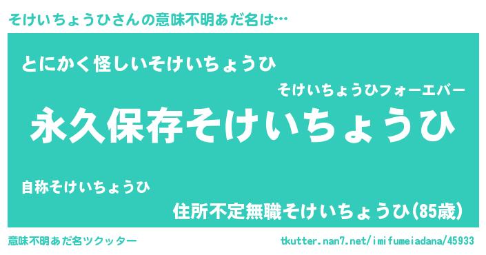 | 男性向けラノベタイトル風あだ名 | 『そけいちょうひという概念が存在しない退屈な世界 』 |