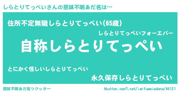 | 男性向けラノベタイトル風あだ名 | 『Re:しらとりてっぺいから始める異世界生活』 |