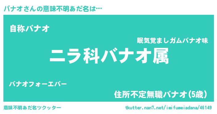 | 男性向けラノベタイトル風あだ名 | 『バナオ~年齢イコール彼女いない歴の魔法使い~』 |