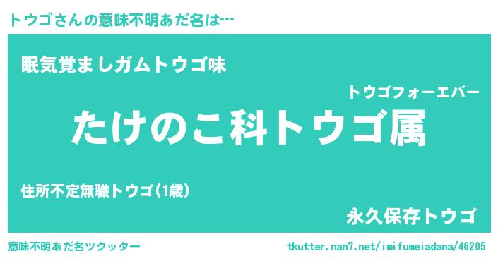 | 男性向けラノベタイトル風あだ名 | 『転生したらトウゴだった件』 |