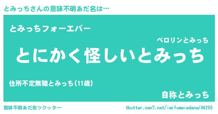 | 男性向けラノベタイトル風あだ名 | 『とみっちの嫁は女の子じゃないと思った?』 |