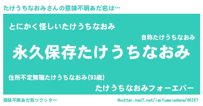 | 男性向けラノベタイトル風あだ名 | 『たけうちなおみという概念が存在しない退屈な世界 』 |