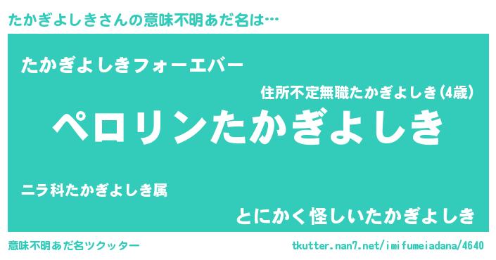 | 男性向けラノベタイトル風あだ名 | 『たかぎよしきの憂鬱』 |